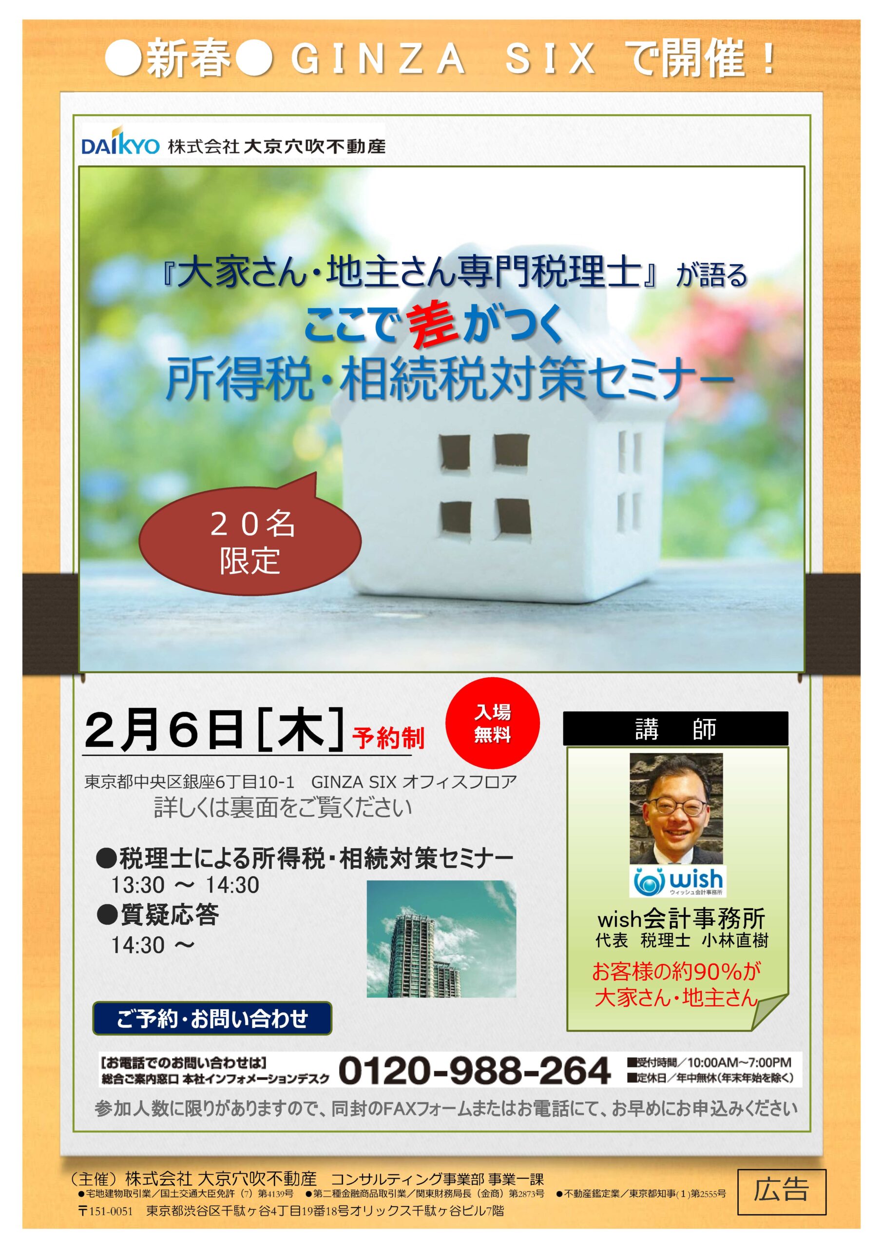 2/6 大京穴吹不動産主催の所得税・相続税対策セミナーに講師として参加します 2025.05.28 SEMINAR 株式会社大京穴吹不動産が主催する『大家さん・地主さん専門税理士』が語る ここで差がつく所得税・相続税対策セミナーに当事務所の代表 小林直樹がセミナー講師として参加します。 日 時:2020年2月6日(木)13:30~会 場:OLIX BANK GINZA PLAZA(GINZA SIXオフィスフロア)定 員:予約制20名受講料:無料 不動産の税務・節税対策に強い税理士 小林直樹がセミナー講師として参加する『大家さん・地主さん専門税理士』が語る ここで差がつく所得税・相続税対策セミナー の詳細は こちらをクリック! Prev Next 一覧へ戻る